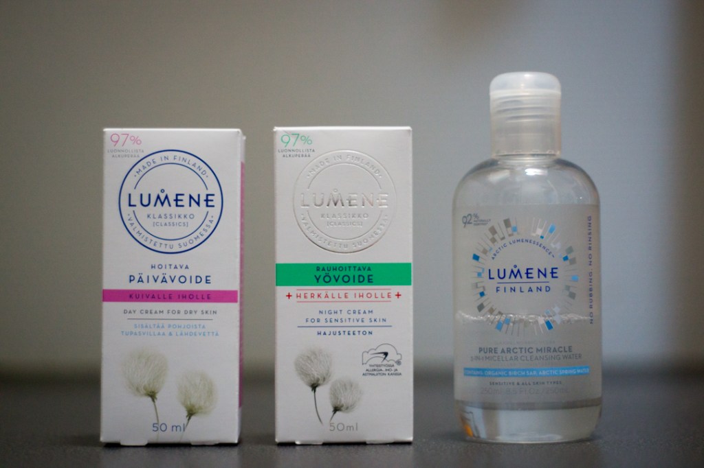 Sopivaa kasvovoidetta etsiskelen vielä. Ennen käytin pitkään Aqualan L perusvoidetta, mutta ainakin nyt talviaikaan se ei tunnu riittävältä. Tällä hetkellä käytössä ovat Lumenen ”hoitava päivävoide kuivalle iholle” ja ”rauhoittava yövoide herkälle iholle”. Kasvojen iho tuntuu tällä hetkellä näillä voiteilla hyvältä, joten ainakin nyt talven yli mennään näillä ja kesäksi ehkä sitten jotakin vähän kevyempää.